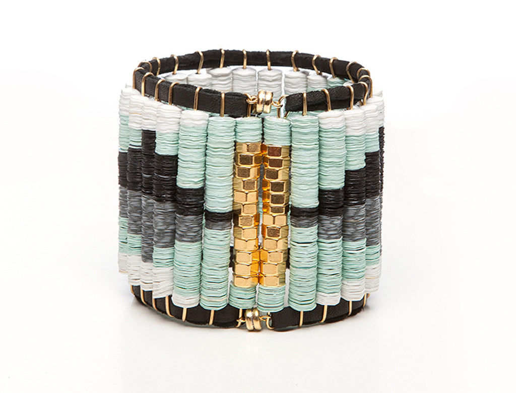 -Weaving of colorful sequins and fine leather straps, combined with 100% gold plated bolts at edges.