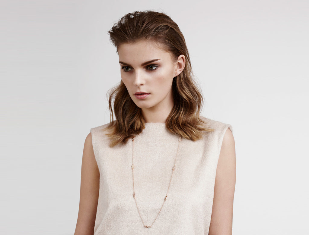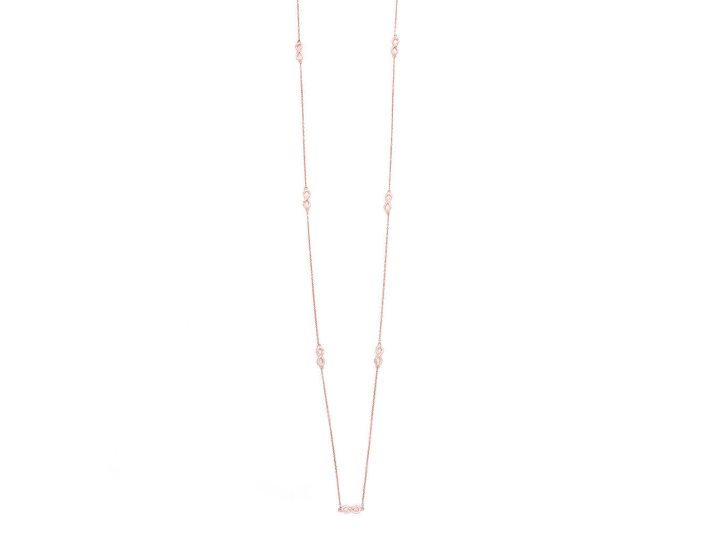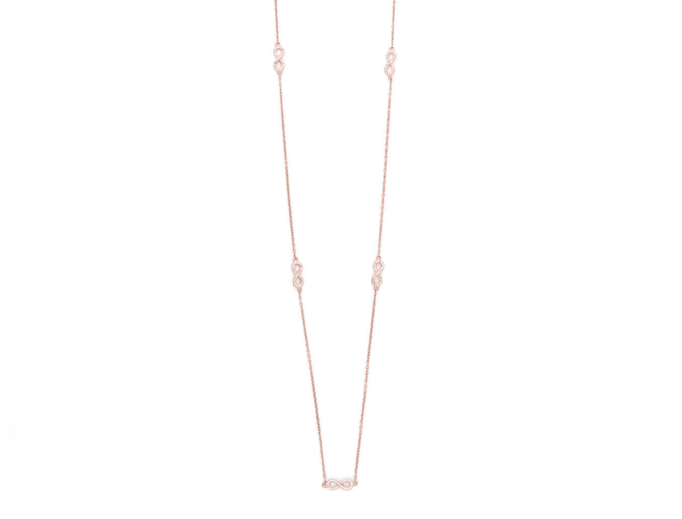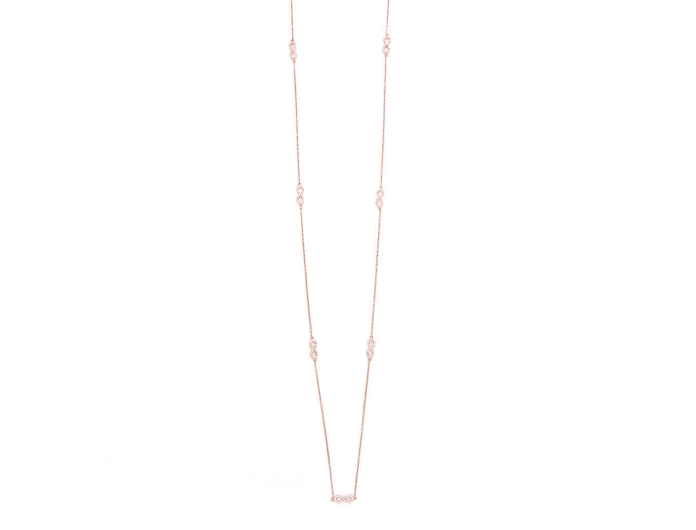 Long necklace with Infinity symbols, set in 18k yellow gold, 18k rosé gold or rhodium plated sterling silver. Every Avinas jewelry piece is stamped with a quality mark "925" and the Avinas Infinity Logo.