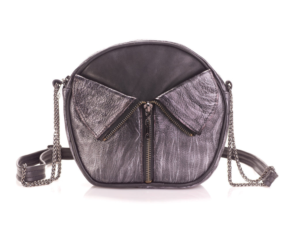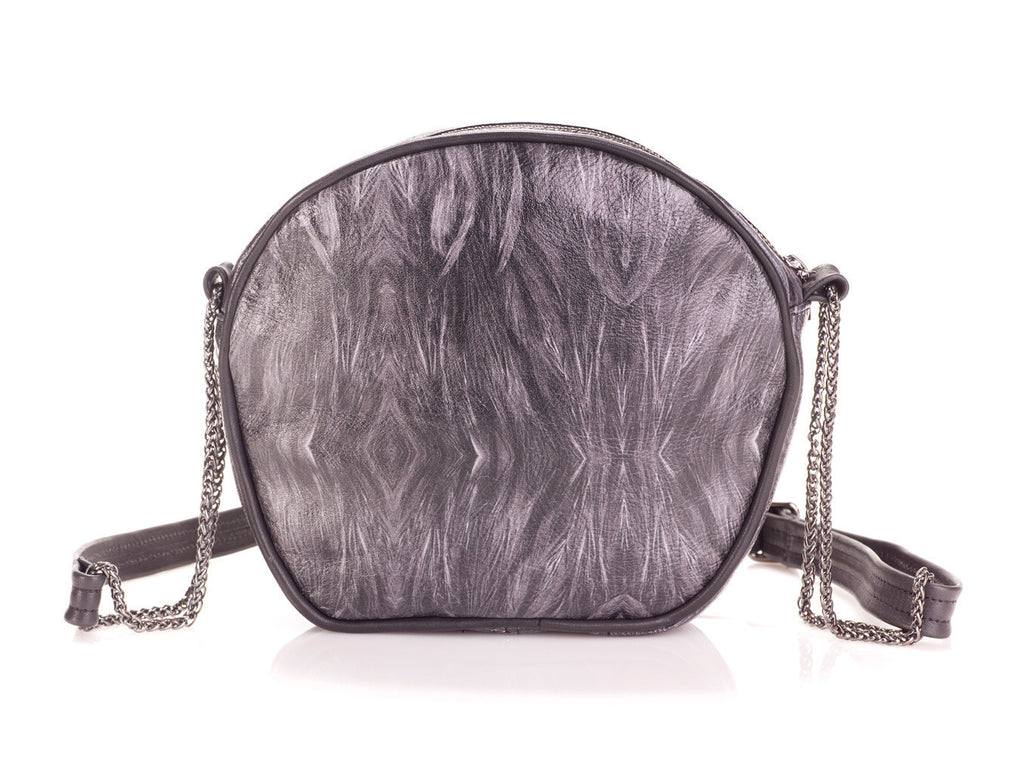 - Small rounded bag made from black feather digital print leather (cowhide)