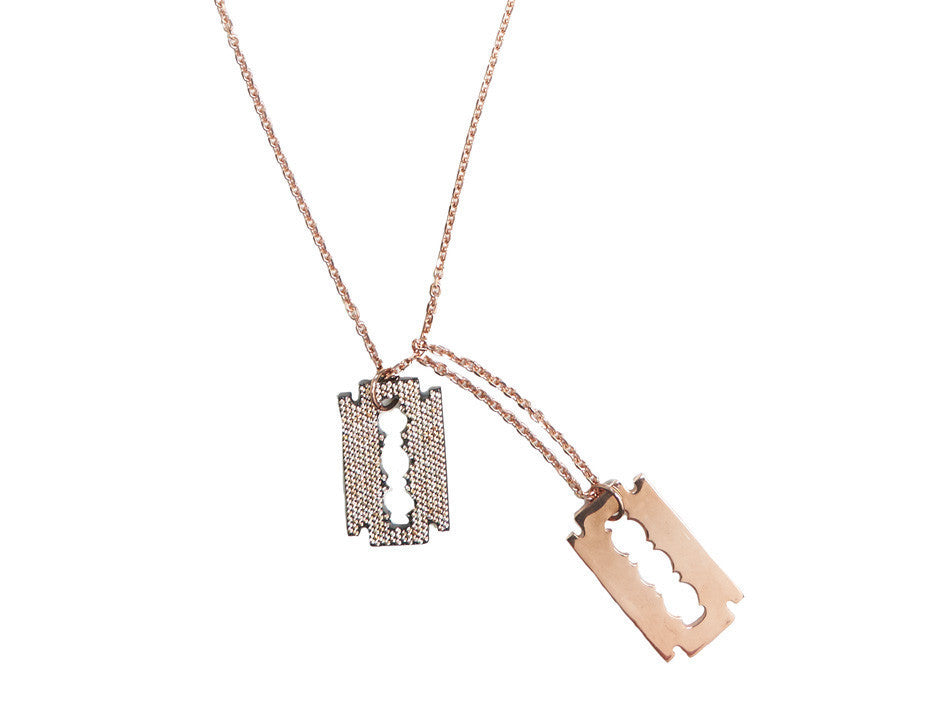 Pendant: Sterling silver, white zircon on black rhodium, and plain bronze plated razor blades.